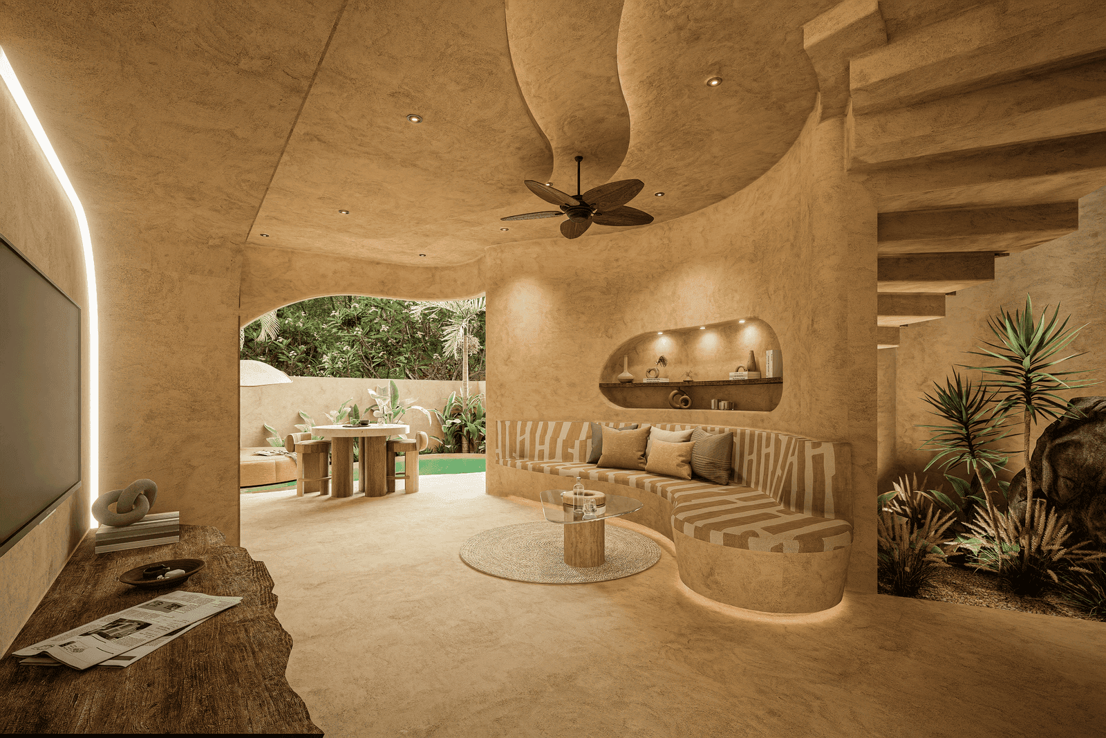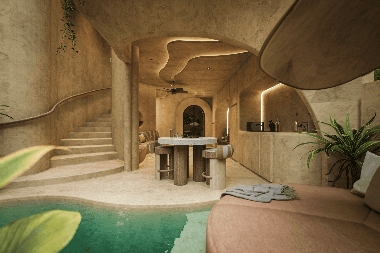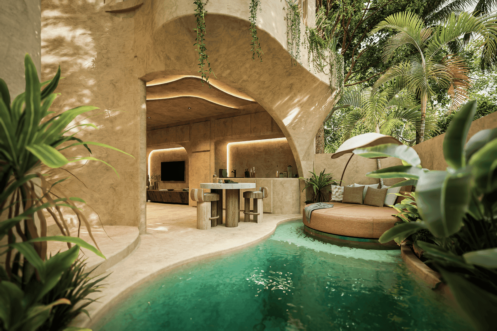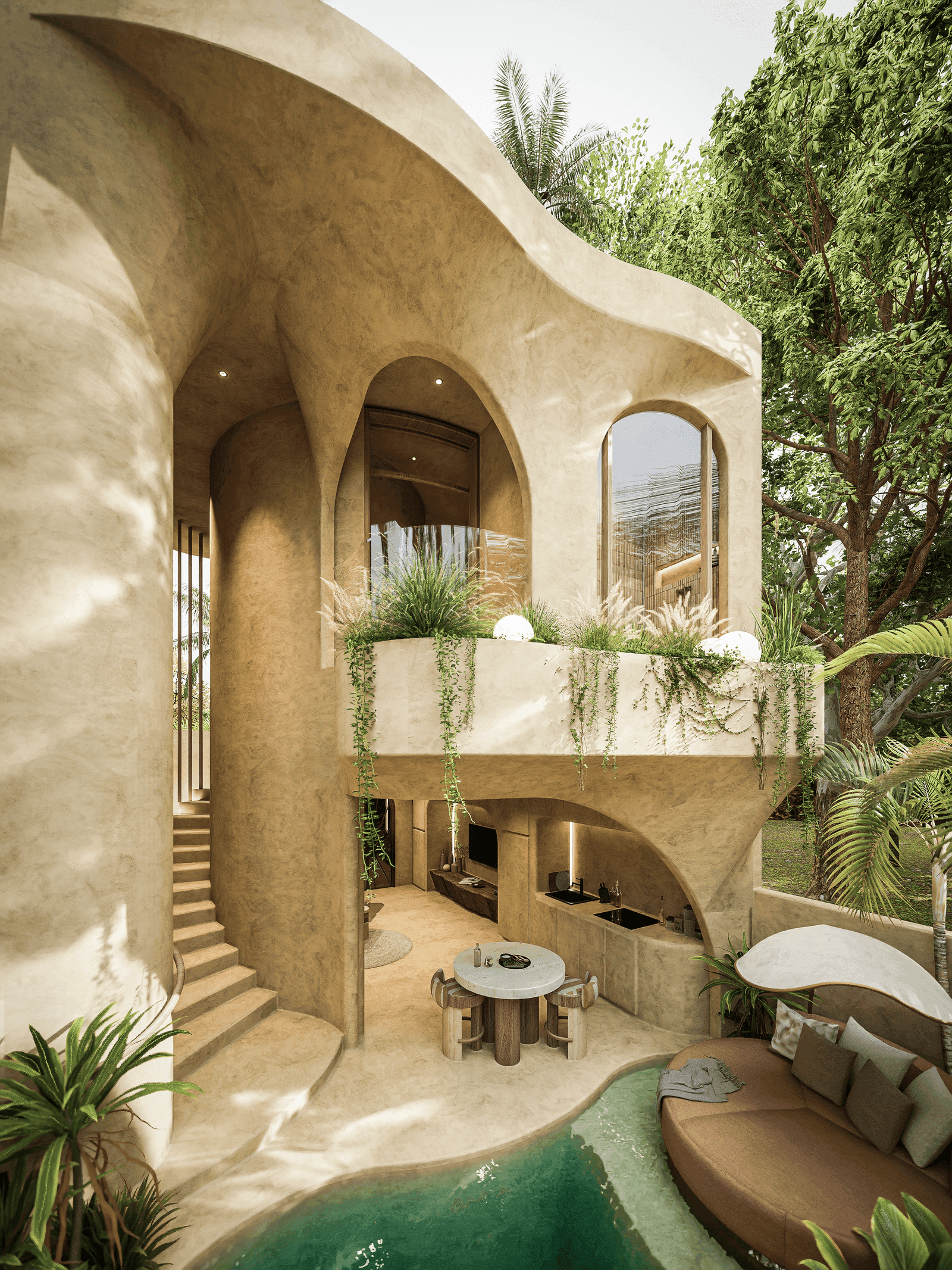 A luxurious two-storey hideaway designed for couples and small families. This one-bedroom villa introduces vertical elegance, elevating the living experience in every sense. The ground floor features open-plan living that flows effortlessly into the outdoors, while the upper level offers a private sanctuary for rest and relaxation. With its sculptural staircase, organic materials, and private pool, this villa embodies modern grace and timeless serenity.