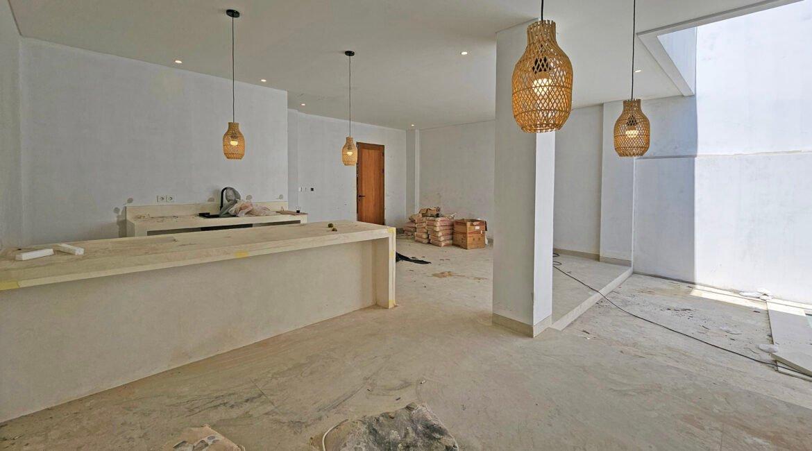 - Spacious Living Area: The large living space includes a storage room and a kitchen equipped with a central island featuring gas hobs and a worktop with a sink. This area opens directly onto the swimming pool, creating a seamless indoor-outdoor living experience.