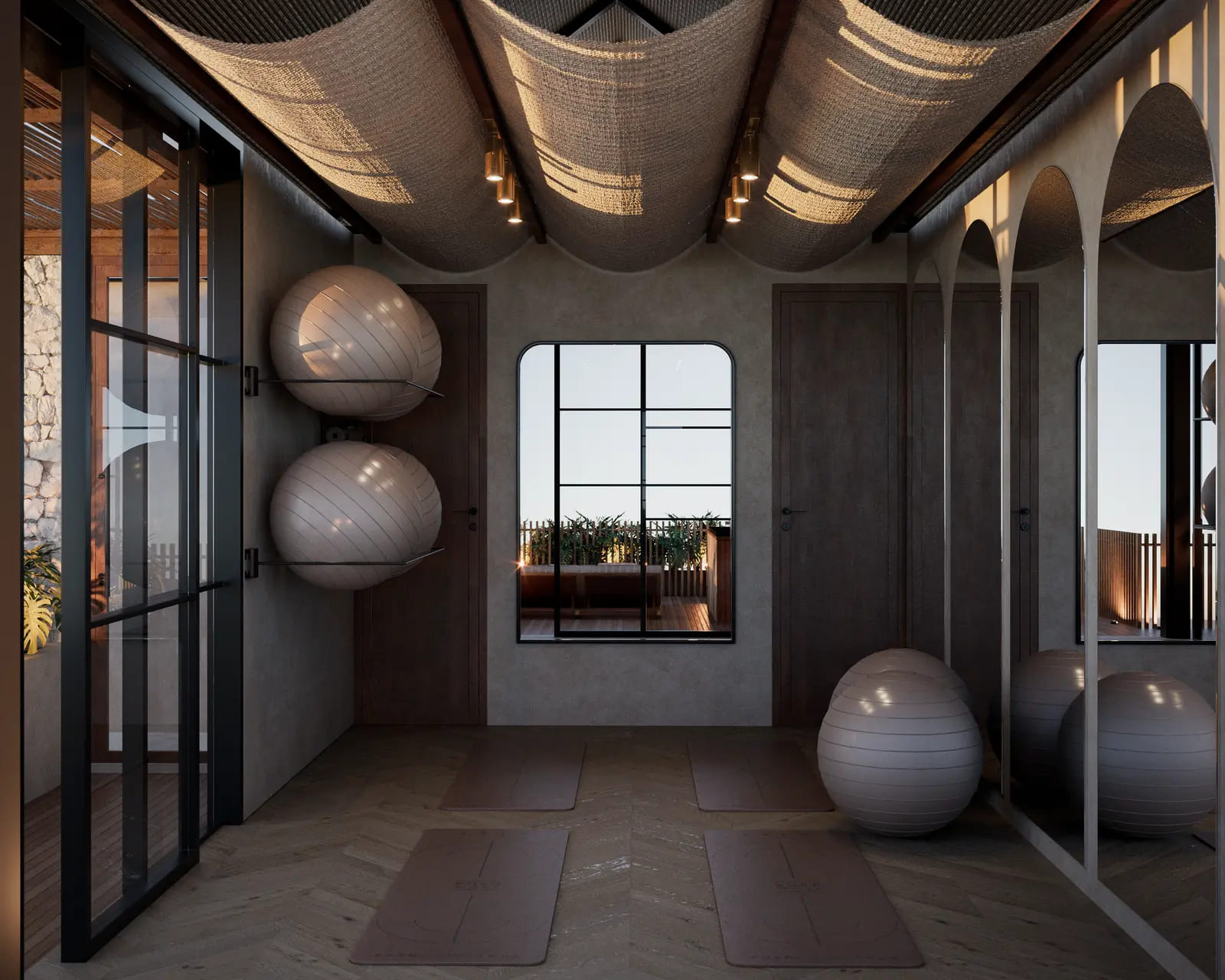 A Mediterranean-style residence on 2.25 ares in Pererenan featuring a bright, simple, and comfortable main house with office, gym, and spacious living area. A rooftop with BBQ, outdoor cinema, and yoga room enhances leisure and social life, while a private guest house completes the property.
