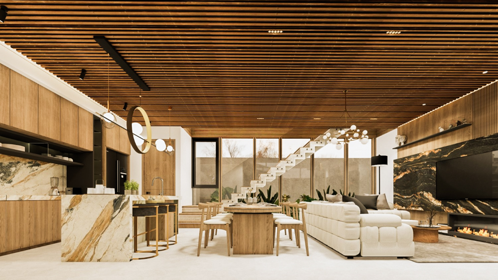 This villa offers expanded living with a larger land footprint and refined architectural detailing. The open living, dining, and kitchen areas enjoy full-height windows that frame the tropical garden and private pool. Warm textures, clean lines, and modern lighting create a serene and upscale ambiance throughout the home.
