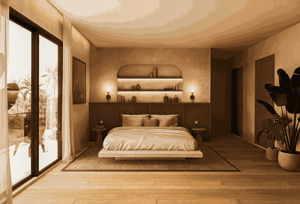 With 203 m² across three floors, this unit reflects the signature design: large arched windows, warm materials, and seamless indoor–outdoor integration. Bedrooms occupy the upper levels, offering privacy and comfort, while the ground floor’s open-plan layout overlooks a private garden. This villa sits in a thriving luxury neighborhood close to Berawa Beach and world-class amenities.