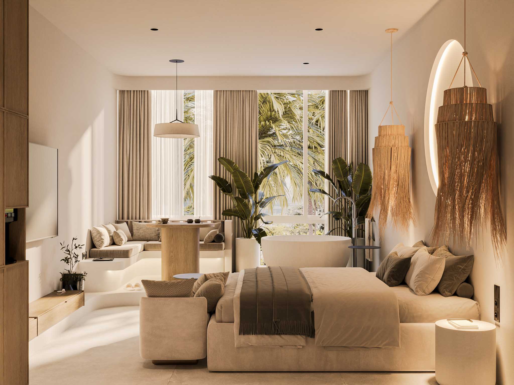This studio apartment is positioned only 200 meters from Berawa Beach, placing it in one of Bali’s most high-demand coastal zones. The layout is optimized for comfort, featuring a stylish sleeping area and a serene bathroom with ocean views. Thoughtful design details enhance both lifestyle use and short-term rental performance.