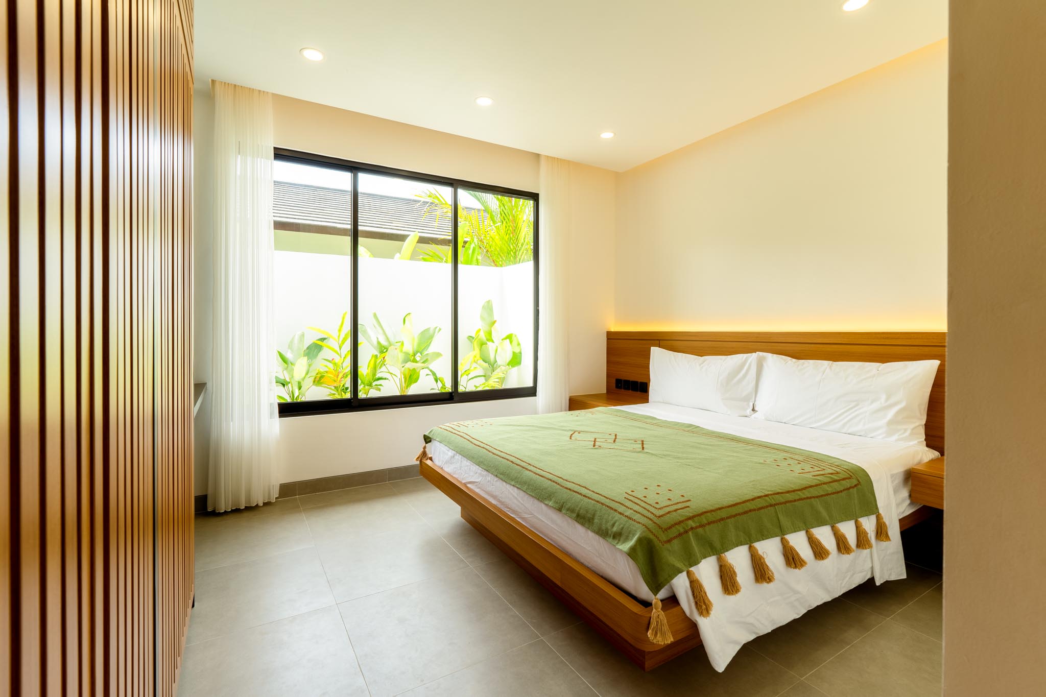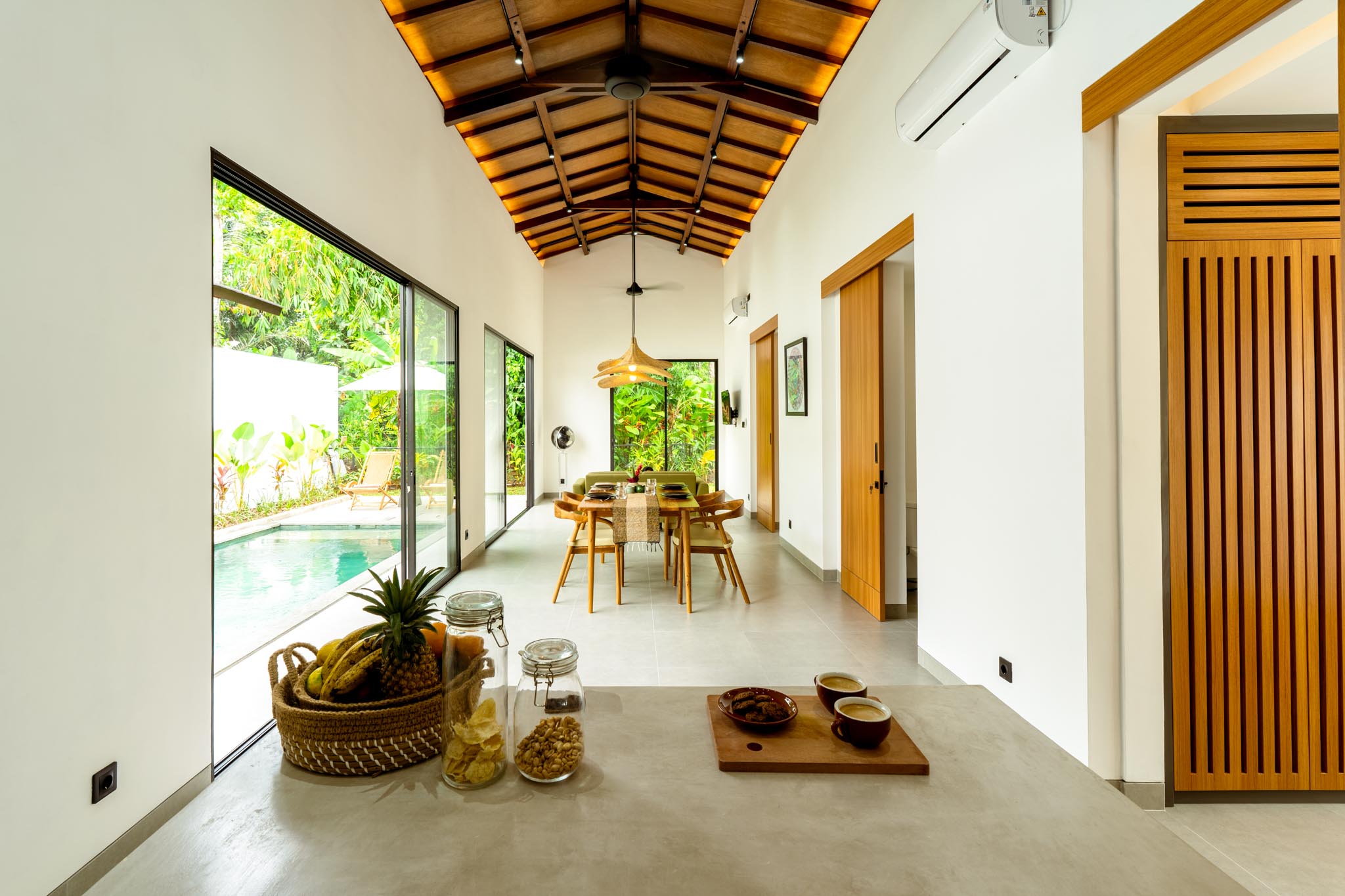 This spacious villa sits on a large land plot and features an open-plan living area that flows seamlessly into the garden and pool. Natural materials, wide glass doors, and shaded terraces enhance daily comfort. The layout prioritizes light, airflow, and practical family living.