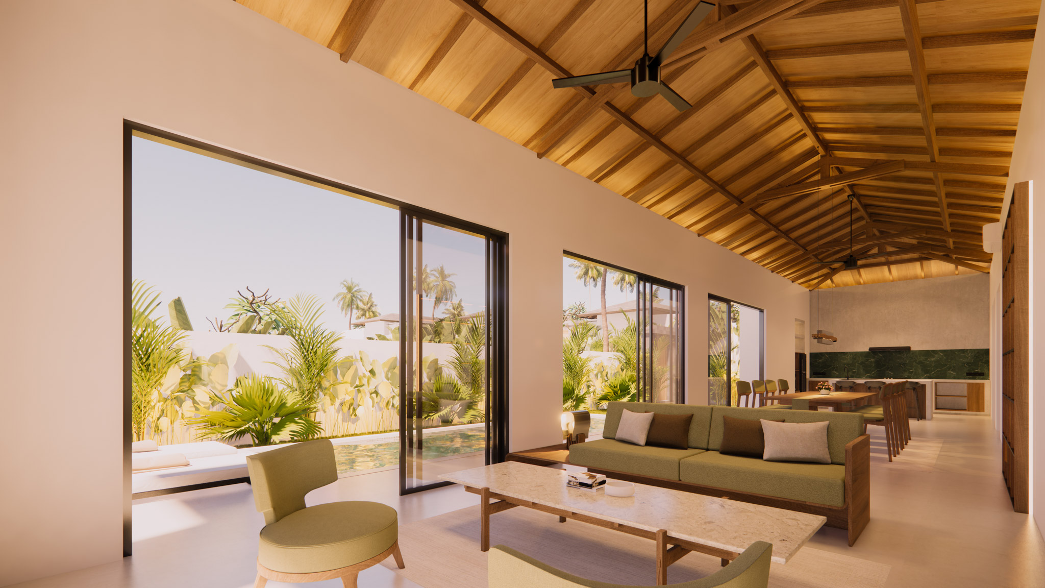 This spacious villa sits on a large land plot and features an open-plan living area that flows seamlessly into the garden and pool. Natural materials, wide glass doors, and shaded terraces enhance daily comfort. The layout prioritizes light, airflow, and practical family living.